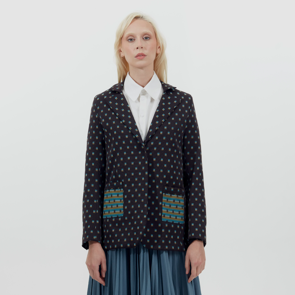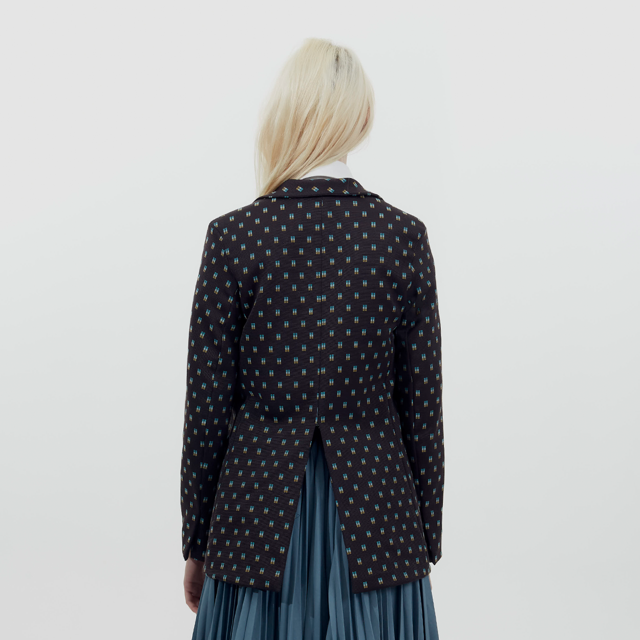 Made from deadstock silk wool, this A-line jacket is both structured and fluid, showcasing a bold checkered intarsia pattern. Two patch pockets offer a utilitarian touch, while a back slit adds ease and movement. A statement in craftsmanship and sustainability, it’s a timeless layer designed to stand apart.